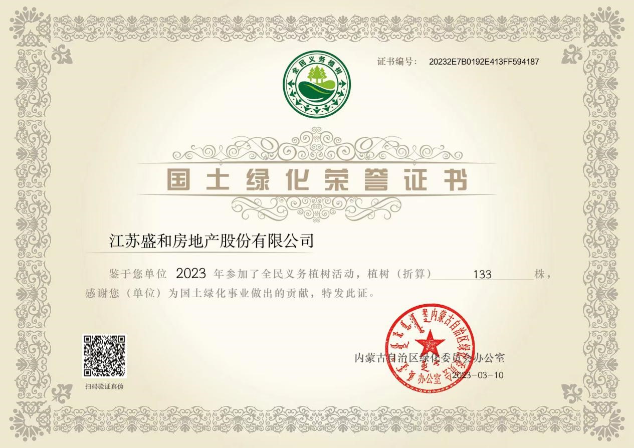 植樹造林,綠化祖國(guó),是我國(guó)的一項(xiàng)基本國(guó)策。今年,盛和房產(chǎn)參與全民義務(wù)植樹“獻(xiàn)一份愛(ài)心 護(hù)沿黃生態(tài)”項(xiàng)目,協(xié)助推進(jìn)黃河流域生態(tài)保護(hù)和高質(zhì)量發(fā)展。公司此次共捐資植樹133株,獲得內(nèi)蒙古自治區(qū)綠化委員會(huì)辦公室頒發(fā)的國(guó)土綠化榮譽(yù)證書。